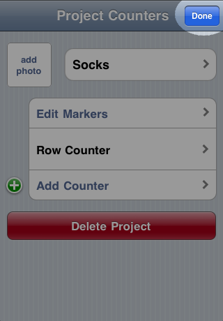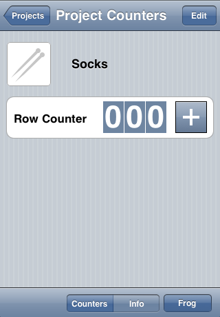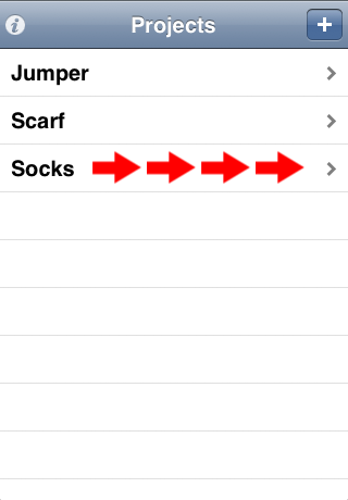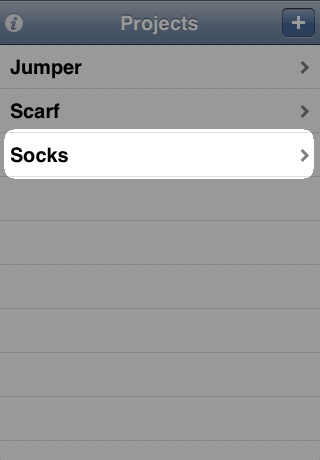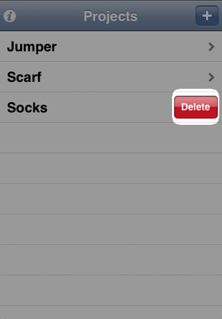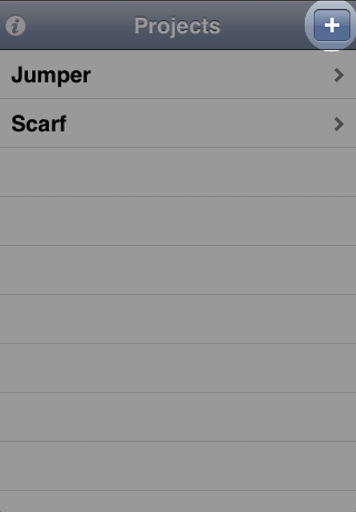 The project list is where you start out in Knit Counter. The name pretty much says it all; it's a list of all the projects you've set up. New projects are created and existing projects viewed from the project list. There's even a quick way to delete projects.