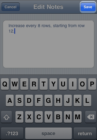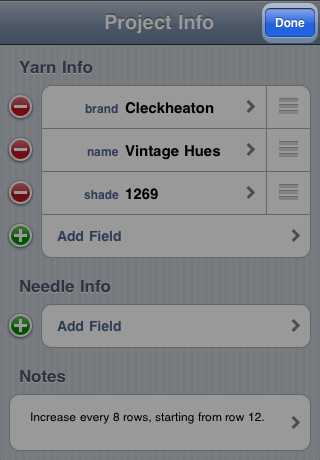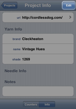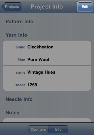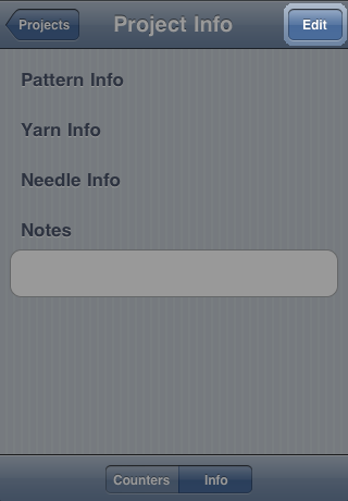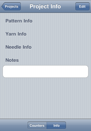 The project info screen supplements the project counter screen by providing a place to store information about your projects. The info screen contains sections for pattern, yarn and needle infomation, as well as a general notes section.