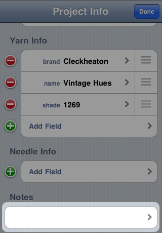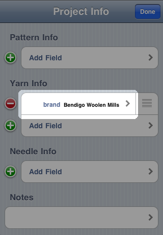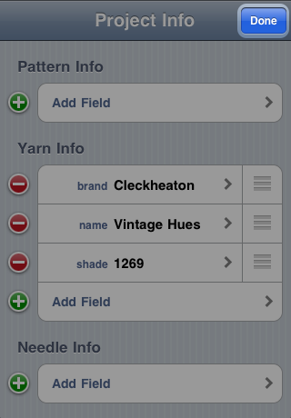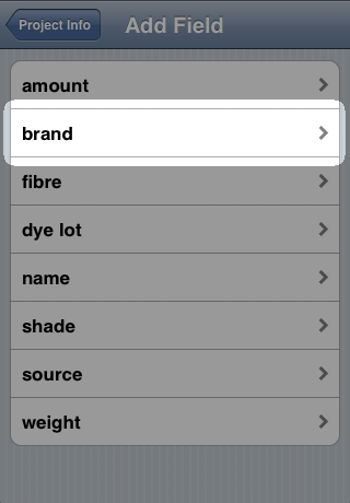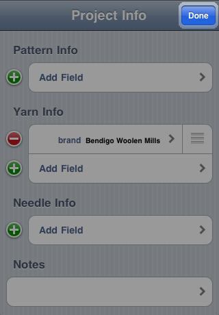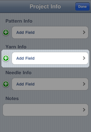 You'll notice there's now an "Add Field" row at the bottom of each section. Tap one of the "Add Field" rows and you'll be shown a list of fields appropriate to the section you're editing. For this example we'll edit the yarn info.